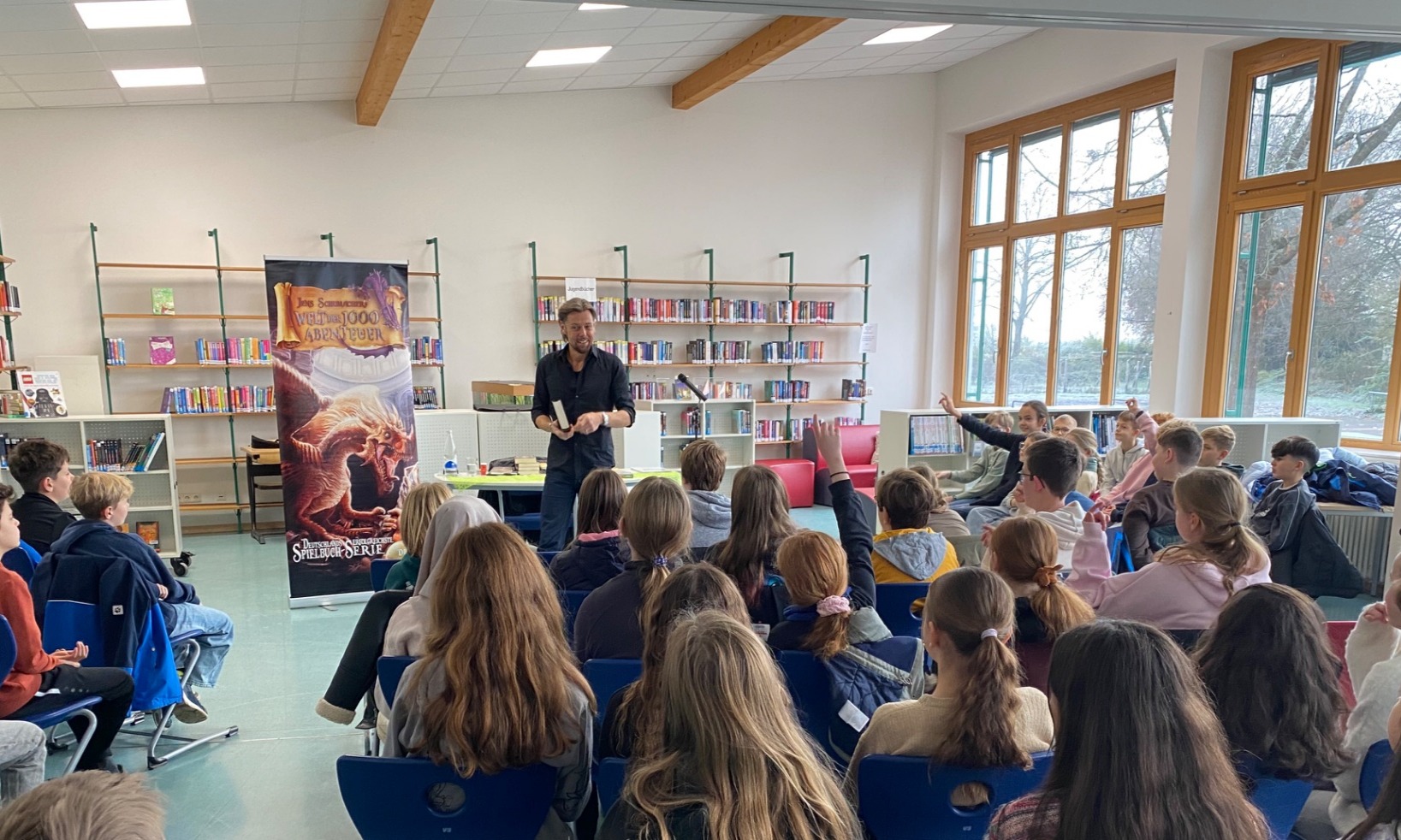 Am 18.11. besuchte der bekannte Kinderbuchautor Jens Schumacher die IGS Salmtal – ein Ereignis, das inzwischen schon fast Tradition hat. Die Schülerinnen und Schüler der 6. Jahrgangsstufe hörten gespannt zu, als er in der Bibliothek der Schule aus seinem interaktiven Abenteuerbuch Der Schatz der Oger aus der Reihe Welt der 1000 Abenteuer vorlas. An mehreren Stellen konnten die Kinder selbst darüber entscheiden, wie die Geschichte weitergeht, sodass die Lesung zu einem lebendigen Mitmach-Erlebnis wurde.