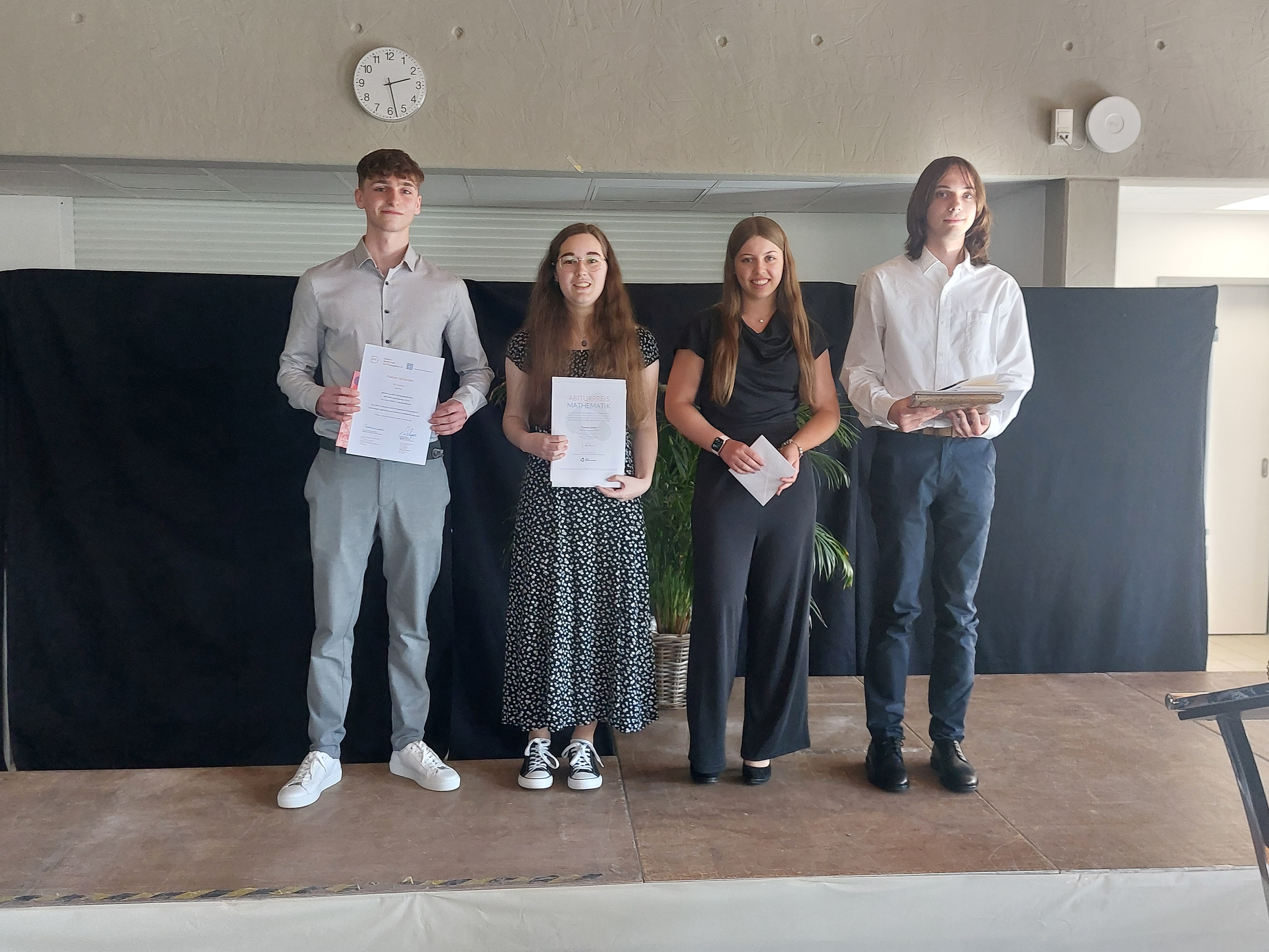 Preisträgerinnen und Preisträger v.l.n.r.: Fabian Schander (Philosophie/Ethik), Theresa Später (Mathe), Miriam Ehses (Kunst), Moritz Witzig (bestes Abitur, Philosophie/Ethik, Geschichte, Latein, Chemie)