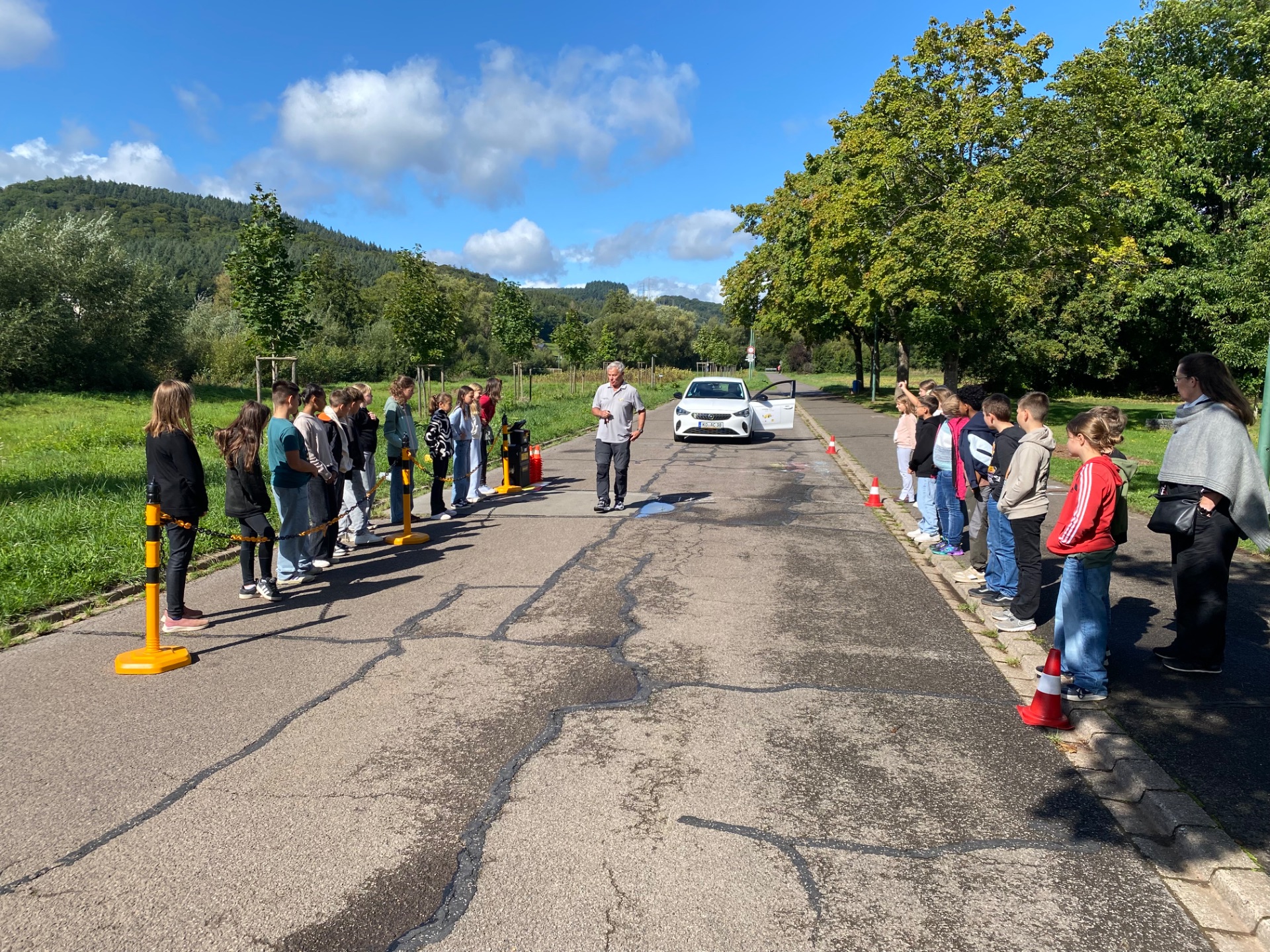 Nicht einfach nur Theorie im Klassenzimmer, sondern echtes Erleben auf einem abgesperrten Straßenabschnitt vor der Schule: Die Schüler sehen mit eigenen Augen und erfahren direkt, wie lang ein Auto wirklich braucht, bis es nach einer Vollbremsung zum Stehen kommt. Dabei wird klar: Autos stoppen nicht sofort, sondern brauchen Platz – und genau das müssen alle Fußgänger wissen.
