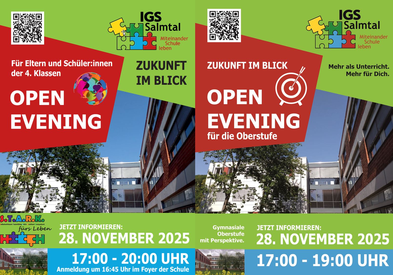 Hinweis: Die Veranstaltung der künftigen 5er beginnt um 17 Uhr und folgt einem festen Ablauf. Hier also am besten mind. 15 Minuten früher da sein, um sich im Foyer der Schule eine Grupennummer abzuholen. Für die Veranstaltung der kommenden MSS (Zugang über den MSS-Trakt) kann man zwischen 17 und 19 Uhr nach Belieben kommen und gehen. Einen Infovortrag zur MSS an der IGS Salmtal gibt es je um 17.00 und 18.00 Uhr.