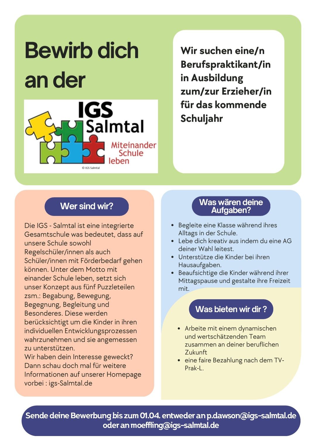 Berufsorientierung wird an der IGS Salmtal großgeschrieben. Daher ist die hauseigene Berufsmesse Ende Mai bereits seit vielen Jahren ein fester Termin und Highlight im Kalender der Schule. Dabei gaben sich auch dieses Jahr Aldi, VET-Concept, die Uni Trier und Co. die Klinke in die Hand. Mit 50 Betrieben, Firmen und Institutionen folgten so viele Teilnehmer wie noch nie der Einladung nach Salmtal und stellten sich und die dazugehörigen Berufsfelder vor. Das fand in Form von Workshops für die 8. und 12. Jahrgangsstufe statt sowie als Messerundlauf, bei dem auch die 9.- und 10.-Klässler dabei waren. Gleichzeitig stellten in diesem Rahmen diejenigen Schülerinnen und Schüler, die im 9. Jahrgang einmal die Woche einen Betrieb besuchen, ihre Projekte vor einer Jury aus aktuellen und ehemaligen Lehrkräften, Vertretern der Betriebe und der Agentur für Arbeit vor. Dieser Praxistag ist eine der drei Säulen, die man in Klasse 9 neben der Akademie oder der schuleigenen Genossenschaft auswählen kann.