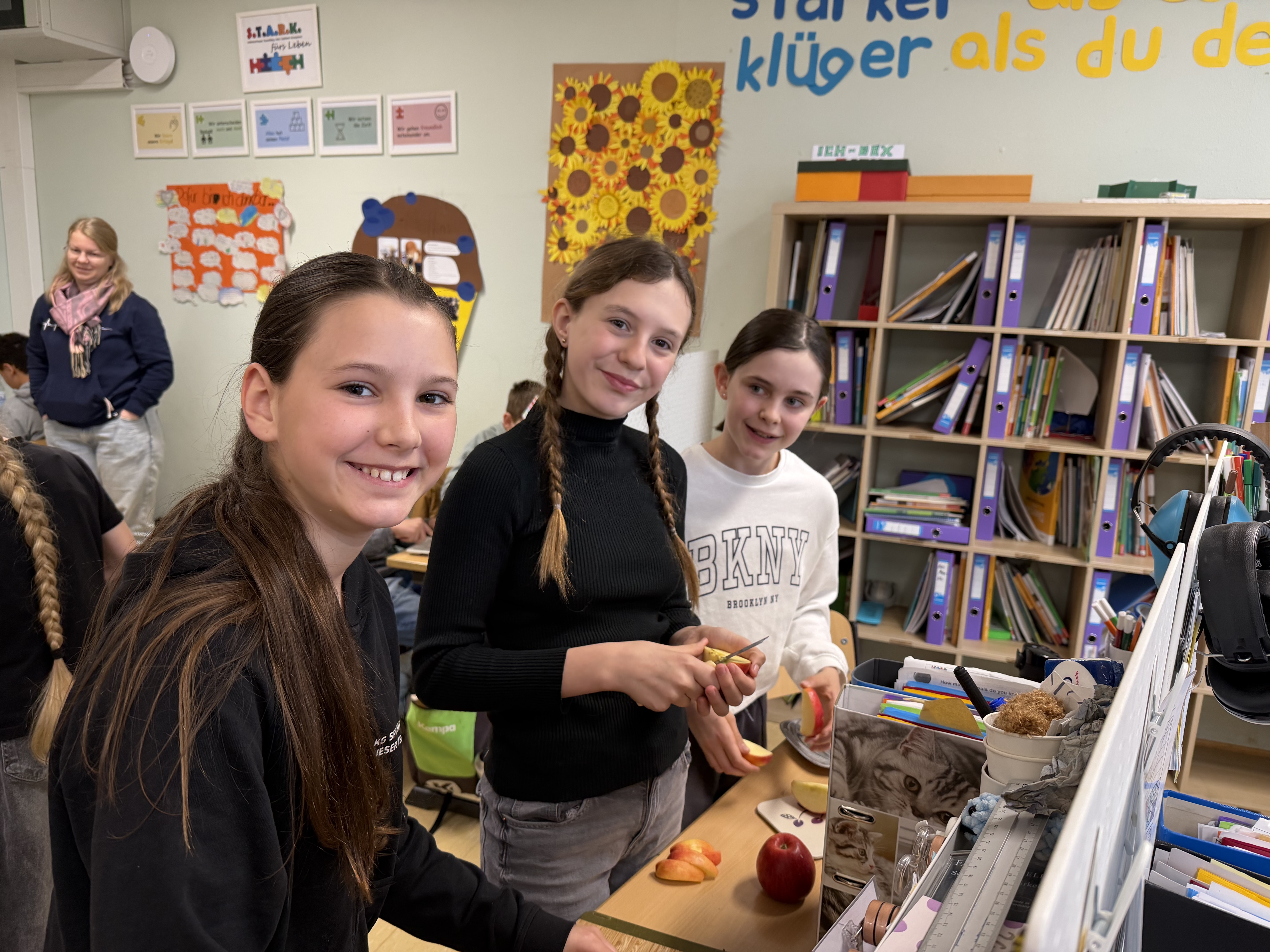 Anschließend wurden sie selbst aktiv: Gemeinsam bereiteten sie ein abwechslungsreiches und gesundes Frühstück für ihre Klasse zu. Auf dem Speiseplan standen unter anderem eine bunte Rohkostplatte, Käse- und Obstspieße sowie Vollkornbrot mit selbst geschüttelter Butter. Den gelungenen Abschluss bildete das gemeinsame Frühstück, bei dem alle die selbst zubereiteten Speisen genießen konnten.